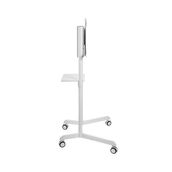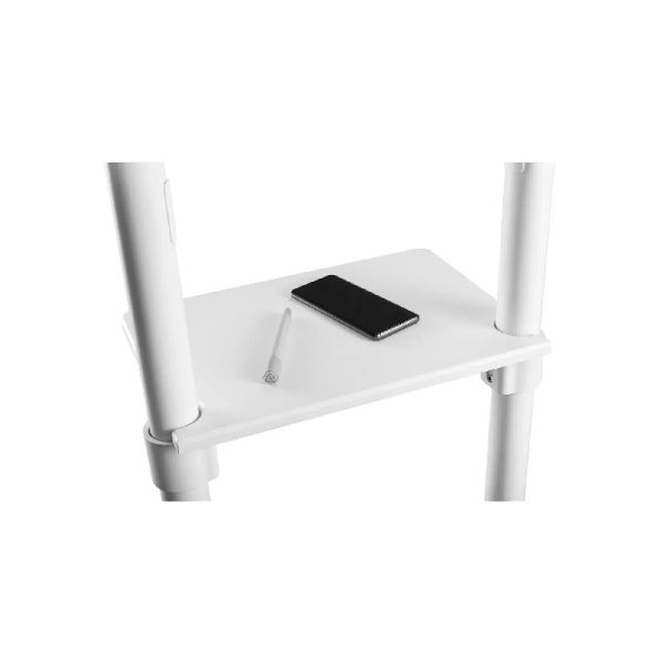 O suporte inclui um tabuleiro para fixar acessórios ou equipamento e possui um sistema de gestão de cabos integrado que mantém tudo arrumado e fora de vista. As pernas arredondadas e os rodízios com bloqueio garantem segurança e facilidade de movimento